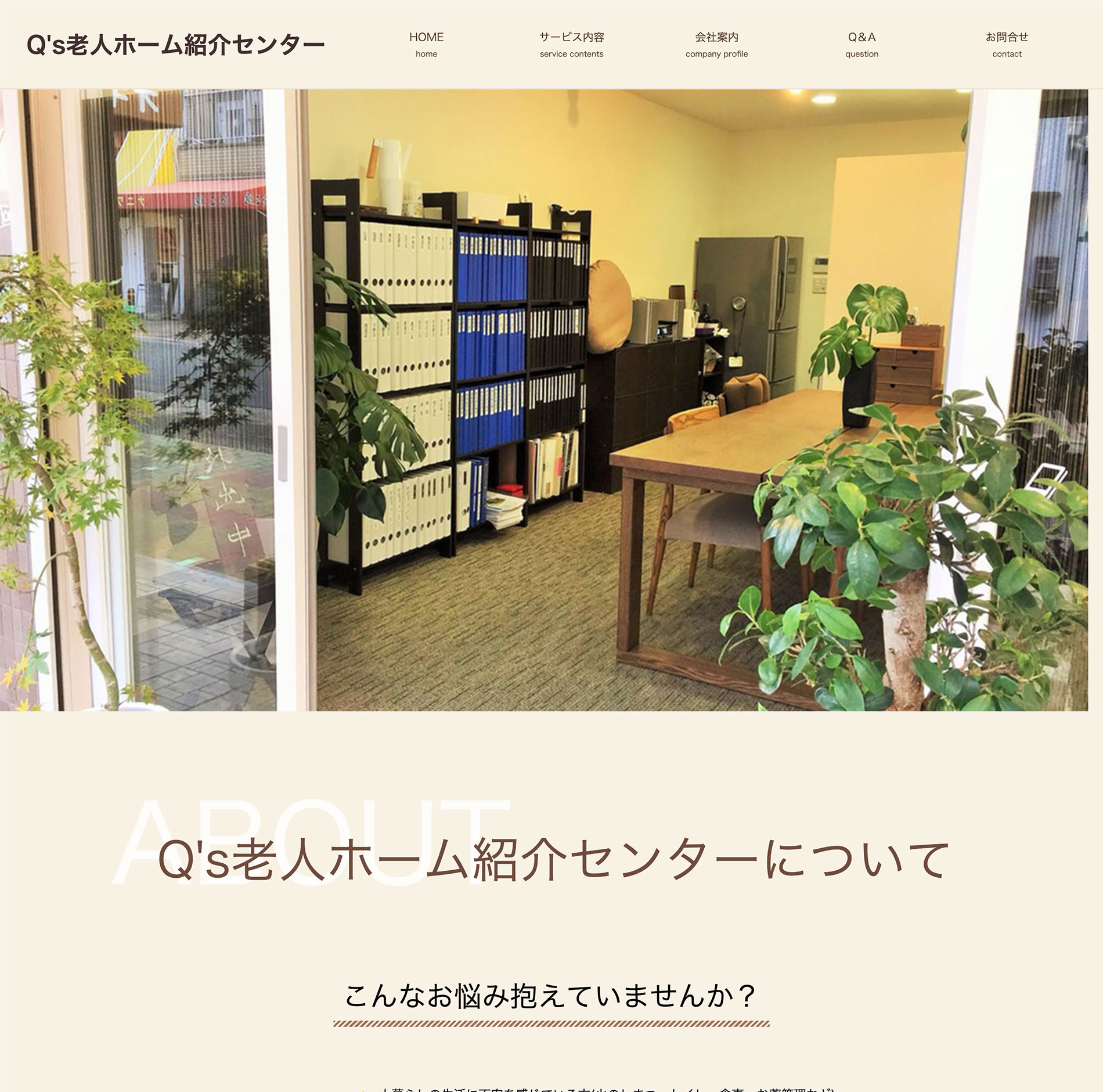 - Q's老人ホーム紹介センターのWebサイトを制作させて頂きました。ご要望としては、他の同業他社のWebサイトの差別化を計るために スタイリッシュでシンプルなデザインにして欲しいとのことでした。ただ、このWebサイトを見るユーザーを考えた時にスタイリッシュ面が多いとあまり見てくれない のかなと感じました。でもご要望にもお応えしたいと思ったのでページの見出しに斜めのデザインや所々にシックな茶系の色みをつけたりしてご要望に応えながら、 ベースの色をベージュ系の温かみのある色をおき、さらにコンテンツごとにあえてたっぷりの空間を持たせて見やすさ読みやすさを意識して落ち着きのあるデザインにしました。